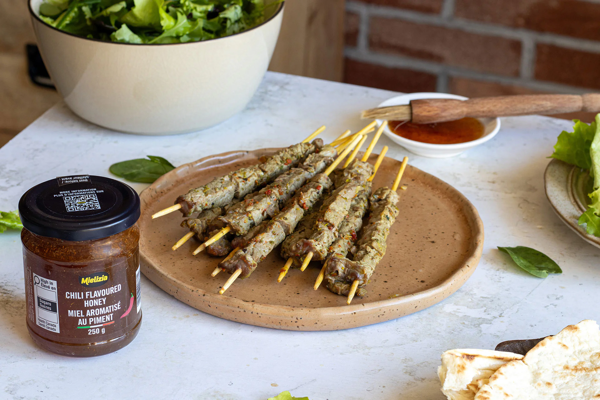 Cuire les brochettes quelques minutes de chaque côté sur le gril. Verser un filet de miel aromatisé au piment juste avant de servir.