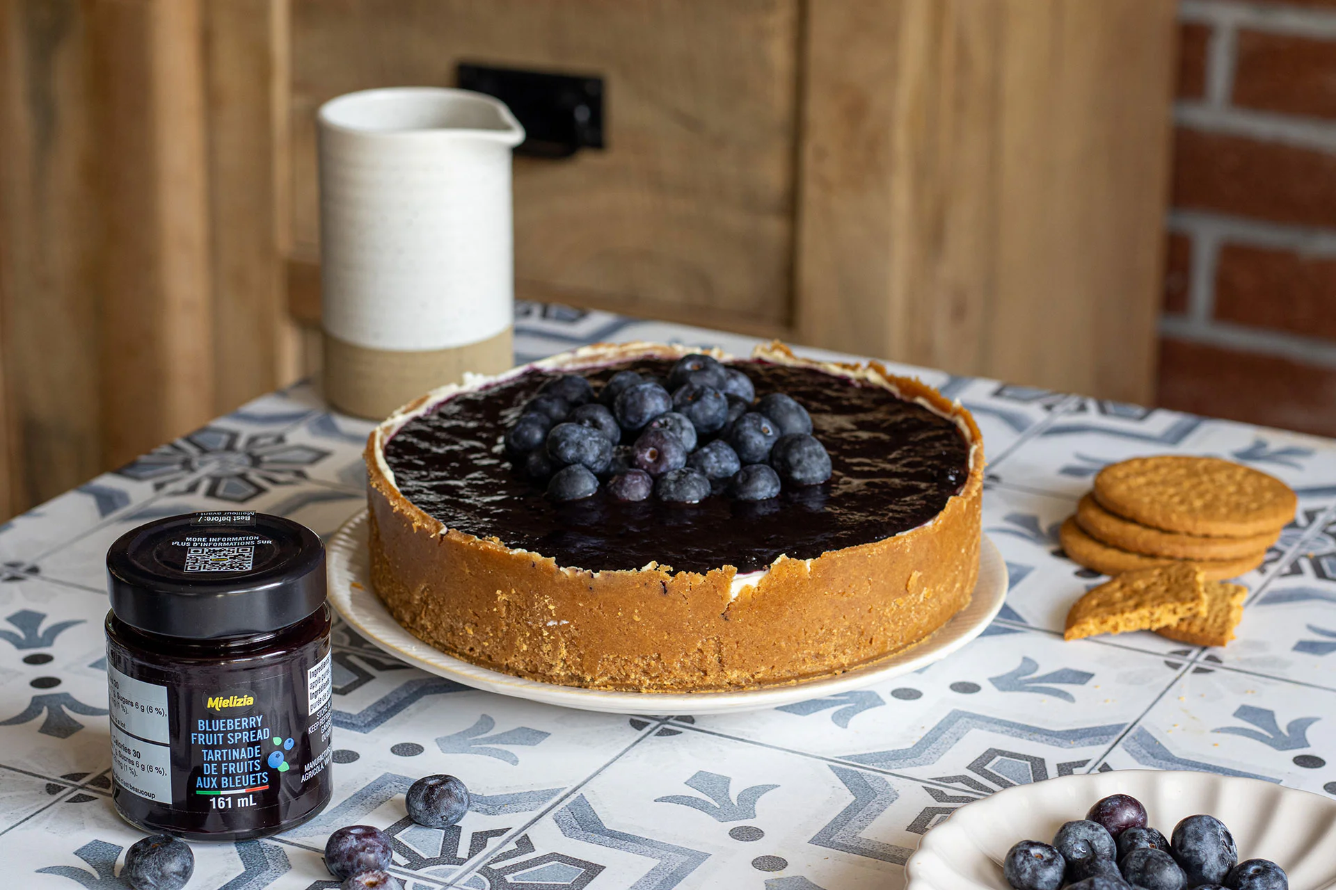 Démouler le cheesecake, déposer 3 à 4 cuillères à soupe de tartinade de fruits aux bleuets sur le dessus et garnir de bleuets frais.