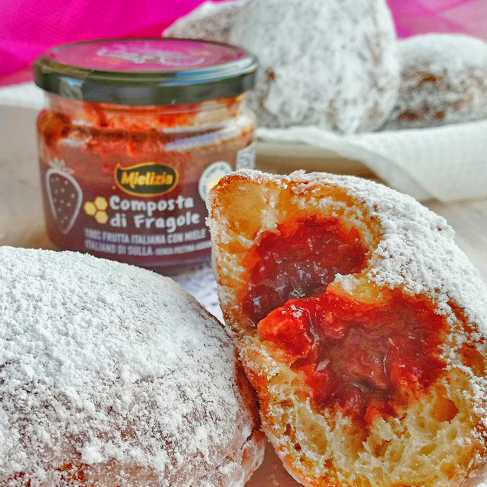 Questi golosi bomboloni sono realizzati al forno, con una soffice pasta lievitata e profumata, resa ancora più deliziosa da un’abbondante farcitura di composta di fragole Mielizia per le vostre merende o colazioni.