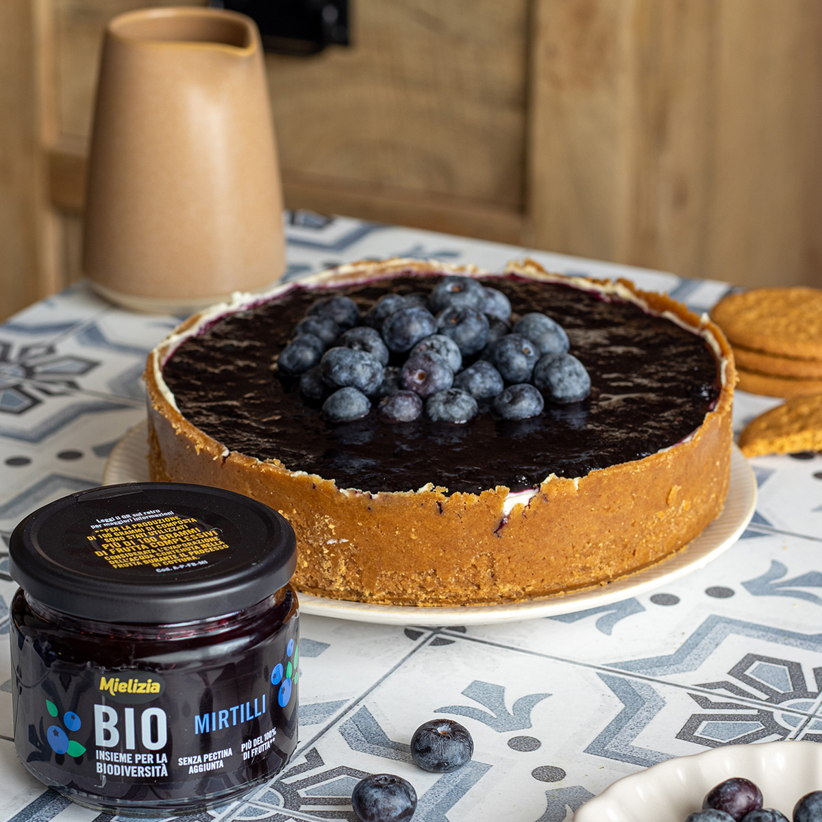 Lascia riposare in frigorifero almeno 4h. Apri la cerniera dello stampo e sforma la cheesecake. Versa sulla superficie 3-4 cucchiai di composta e decora con mirtilli freschi.