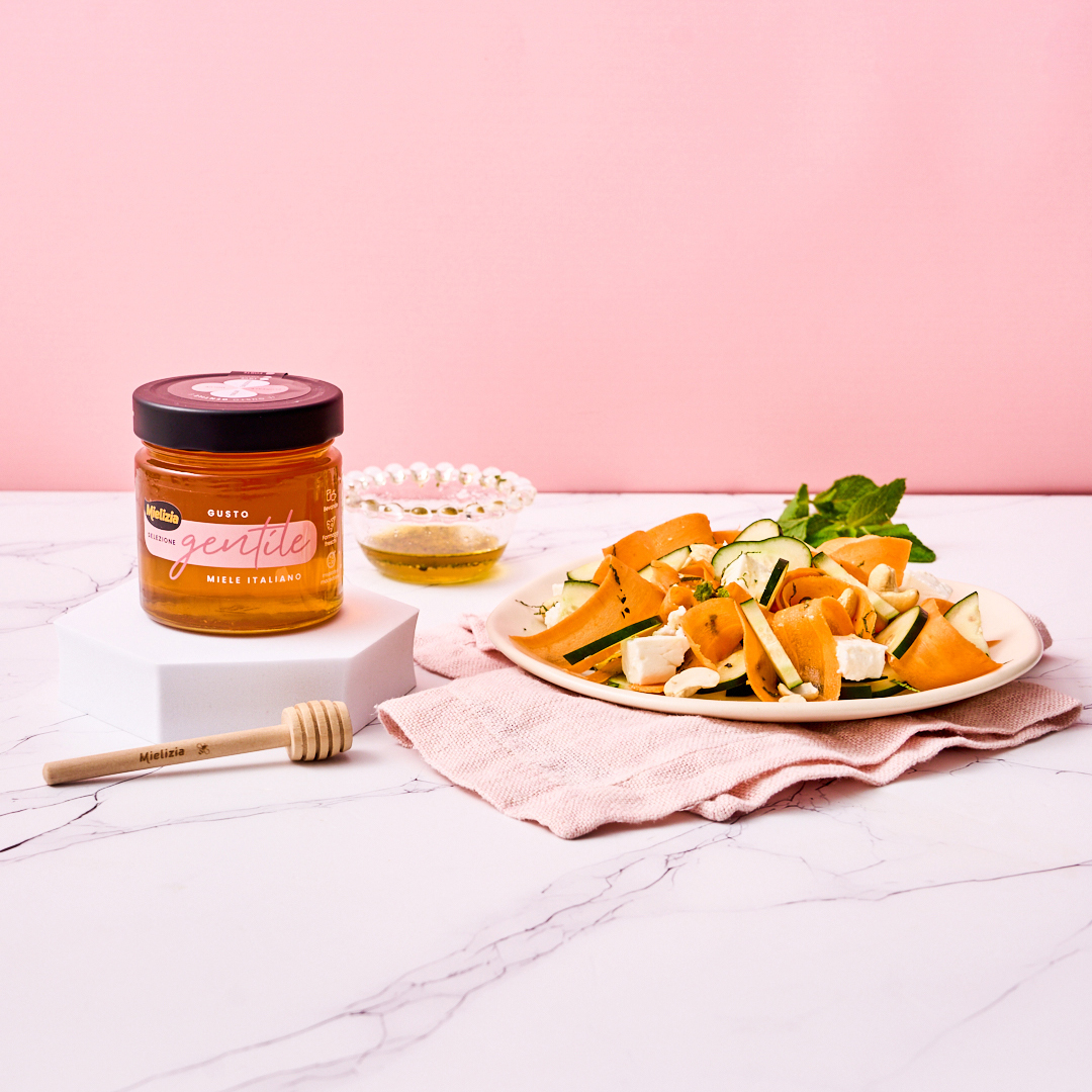Pelate le carote e tagliatele a strisce, dopodiché affettate il cetriolo a mezze rondelle. In una ciotola, preparate il dressing emulsionando olio, succo e scorza di lime, miele, sale e pepe. Distribuite le verdure nei piatti, aggiungete la feta sbriciolata, gli anacardi e la menta tritata finemente. Completate con il dressing e servite subito.