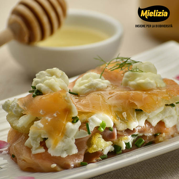 Ripetere la stessa operazione per due o tre strati, creando varie monoporzioni di millefoglie sovrapponendo nell’ordine salmone, formaggio, miele, pinoli ed erba cipollina.