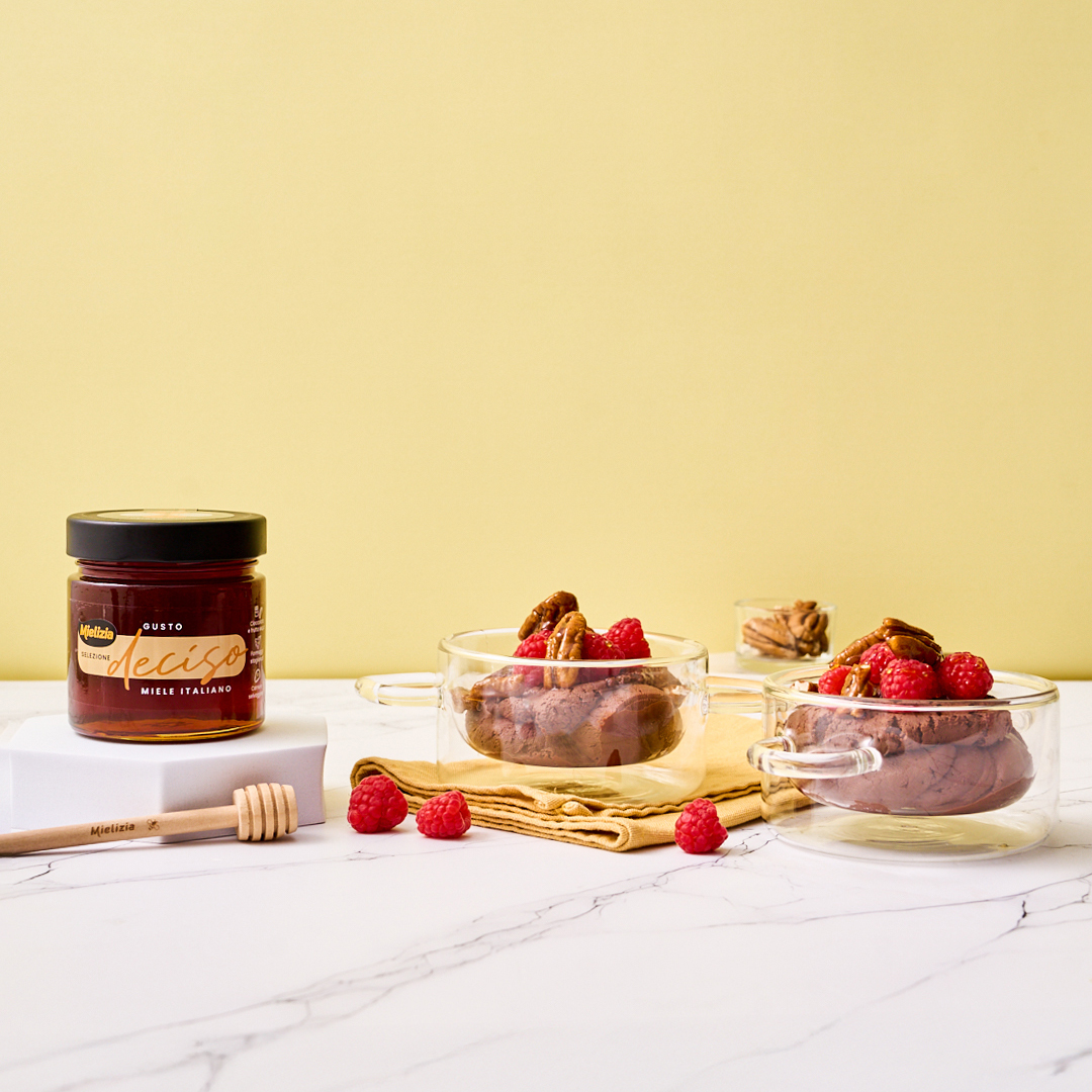 Mousse di cioccolato fondente, con lamponi, noci pecan e miele “Selezione – Gusto Deciso”