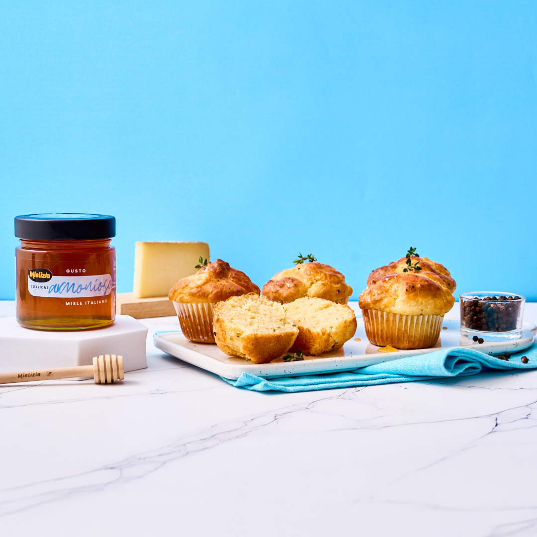 In una ciotola, mescolate uova, latte e olio. Aggiungete farina, sale, lievito, pecorino grattugiato, ¾ del pecorino fresco a dadini e abbondante pepe, quindi incorporate il miele amalgamando bene il tutto. Riempite i pirottini fino a poco sotto il bordo, aggiungete qualche dadino di pecorino, spolverate con pepe e cuocete in forno a 180°C per 20-25 minuti. Una volta sfornati, sformate i muffin, irrorate la superficie con un filo di miele e completate con qualche foglia di timo fresco.