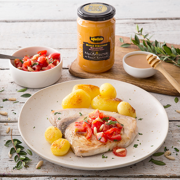 Il pesce spada al miele millefiori, pomodorini e patatine novelle è una ricetta originale con un abbinamento insolito e sfizioso: il miele millefiori ha infatti un sentore dolce e fruttato, che si sposa perfettamente con le carni delicate del pesce spada e l’acidità del pomodoro. I tranci di pesce spada, appena scottati in padella, cuociono al forno con poco olio e poi si servono coperti da una dadolata di pomodori aromatizzata: una secondo piatto gustoso, sano e leggero. Ricetta realizzata per Mielizia da “Il Cucchiaio D’Argento“.