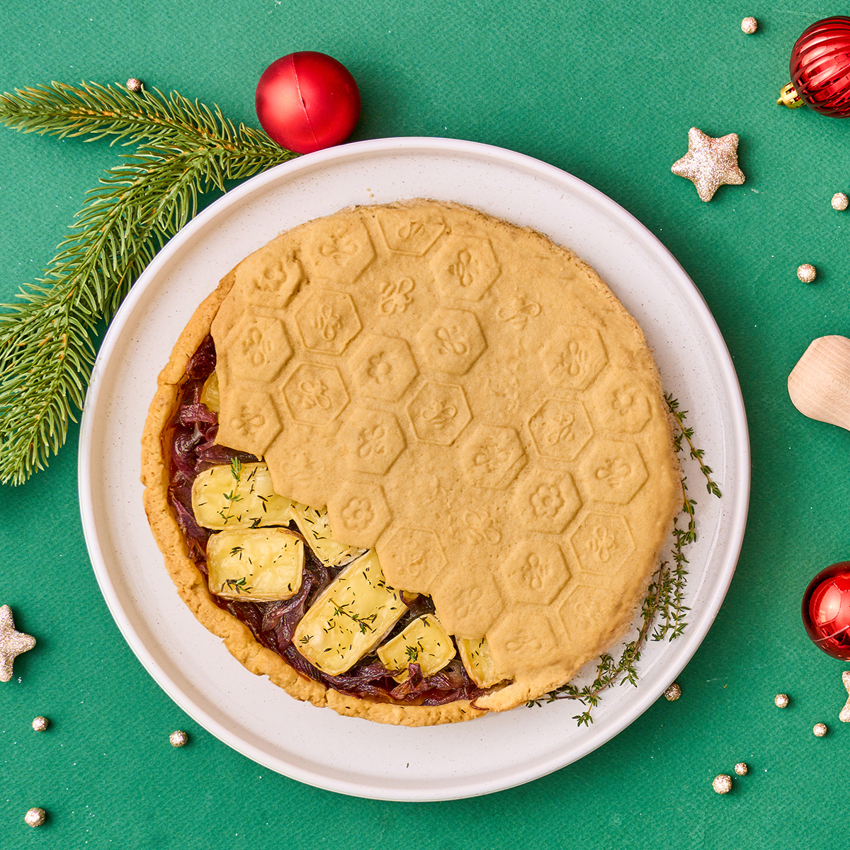 Con il matterello stendete 2/3 della pasta e foderate una tortiera da 22–24 cm. Bucherellate il fondo con una forchetta e distribuite le cipolle caramellate sul fondo, aggiungete il brie a fette e qualche fogliolina di timo. Stendete poi la pasta rimasta, imprimete il decoro con il matterello in dotazione, capovolgete su un altro foglio di carta e coprite parzialmente la superficie della torta. Infornate a 180 °C per 40–45 minuti, finché la superficie sarà dorata e il formaggio fuso. Lasciate intiepidire, poi servite a fette con un filo di miele e timo fresco.