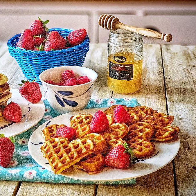 Waffle dolci e salati con miele di acacia e polline