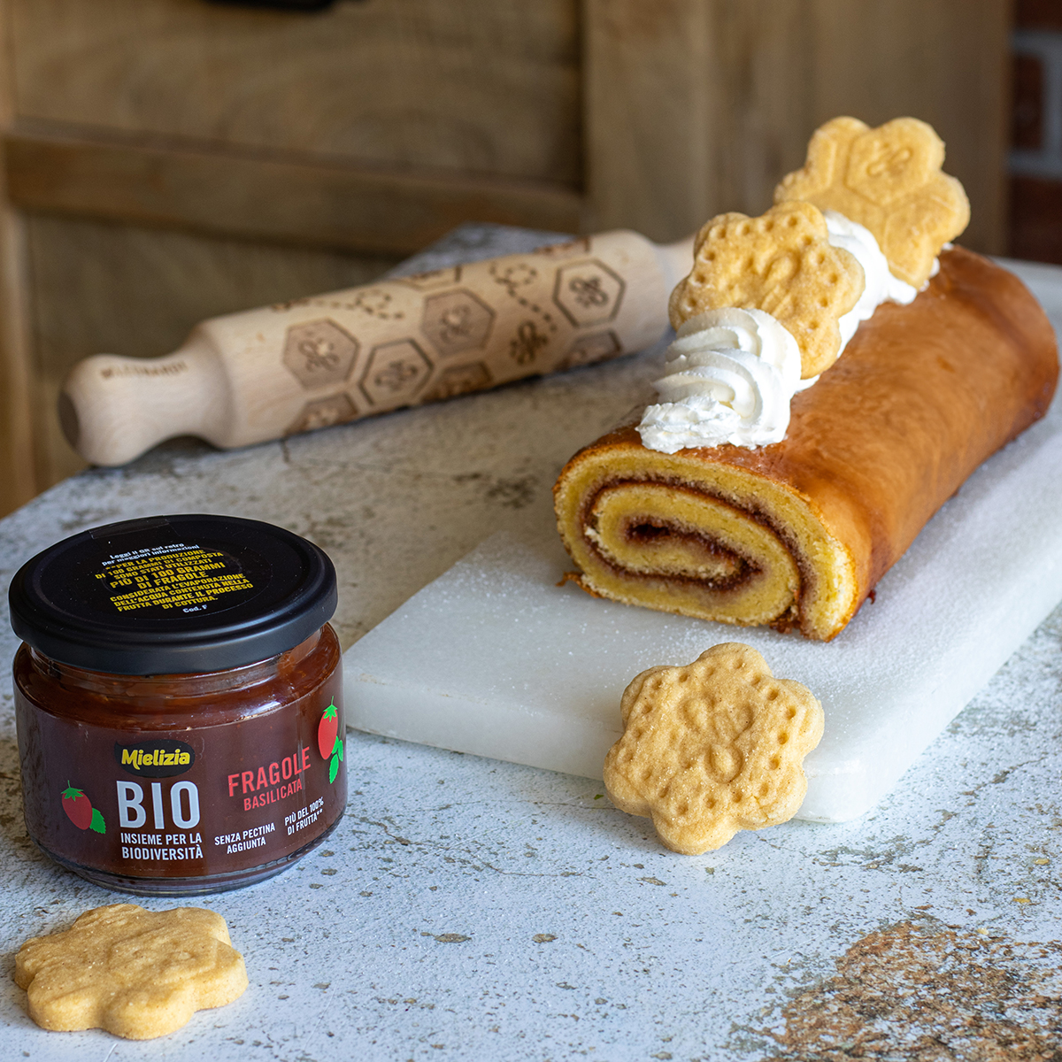 Sforna, capovolgi su un panno pulito e arrotola. Lascia raffreddare completamente, farcisci con la composta alle fragole e arrotola nuovamente.
