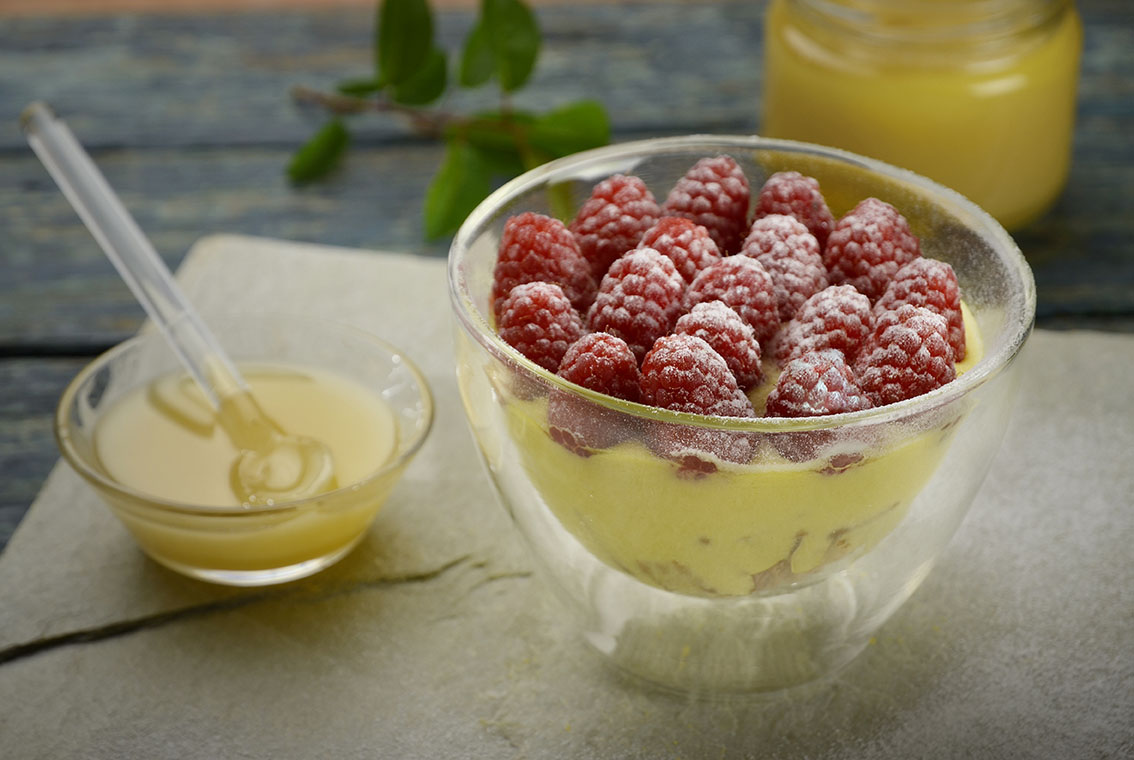 Disporre i biscotti alla cannella sul fondo di una ciotola creando una base di circa 1 cm. Distribuire la crema al mascarpone sui biscotti e aggiungere poi i lamponi. Mettere la ciotola così preparata in congelatore, fare riposare ed estrarre poco prima di servire. Per la ricetta è possibile utilizzare altri frutti rossi, purché siano freschi e non congelati.